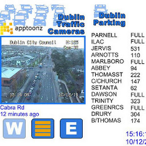 All Dublin City Council traffic cameras updated every 10 minutes. Covers M1 from Balbriggan, around M50 to Ballinteer. Also N11, City Quays and centre city cameras.In addition, Car park information is provided.